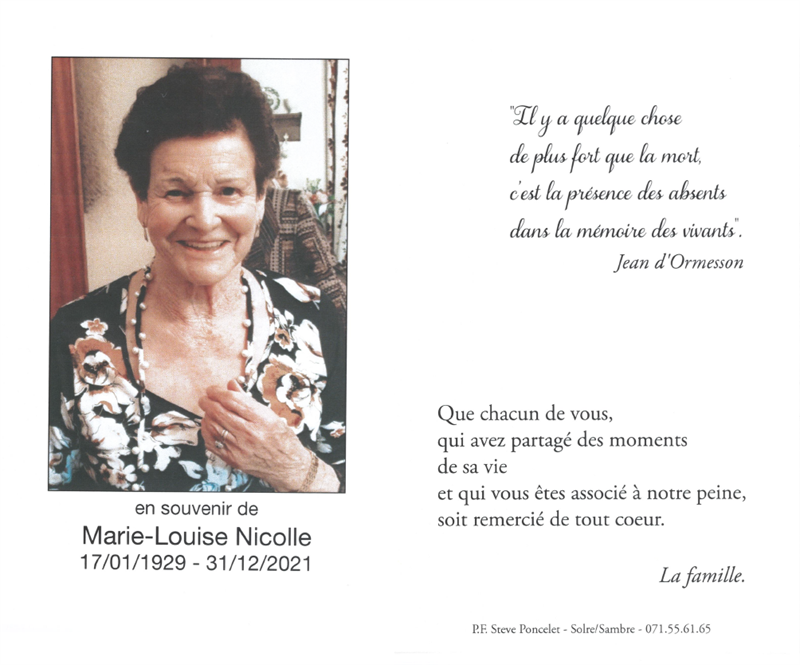 Décédée à Solre-sur-Sambre (6560) le vendredi 31 décembre 2021 à l'âge de 92 ans